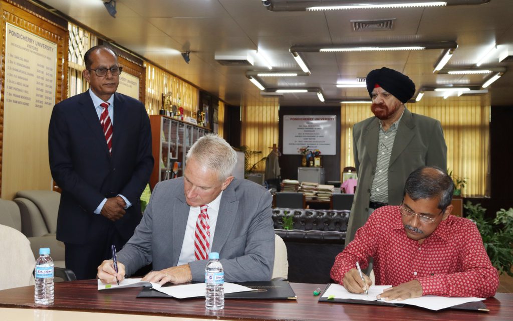 MoU Signing Ceremony between Pondicherry University and Indiana University (IU) held on 18.07.2022. Prof. Mark Canada, Dy. Chancellor, IU & Registrar, PU signed the MoU in the presence of Vice-Chancellor Prof. Gurmeet Singh, Prof.Chitti Babu, Dean, SoB, IU, Dean (SoM), Dean (IR), & Faculties.