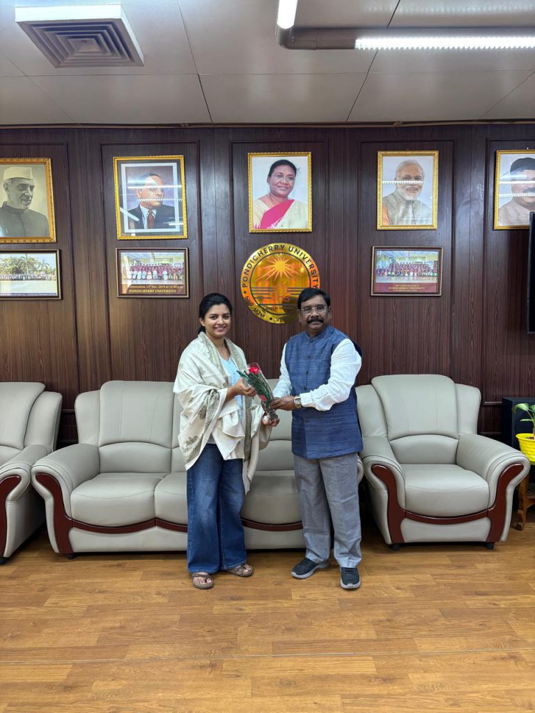 Prof. P. Prakash Babu, the Honourable Vice-Chancellor of Pondicherry University, honoured Ms. Lijomol Jose, distinguished alumna of the Department of Library and Information Science, on receiving the Kerala State Film Awards 2025 for Best Character Artiste (Female) and the Tamil Nadu State Film Awards 2021 for Best Actress.