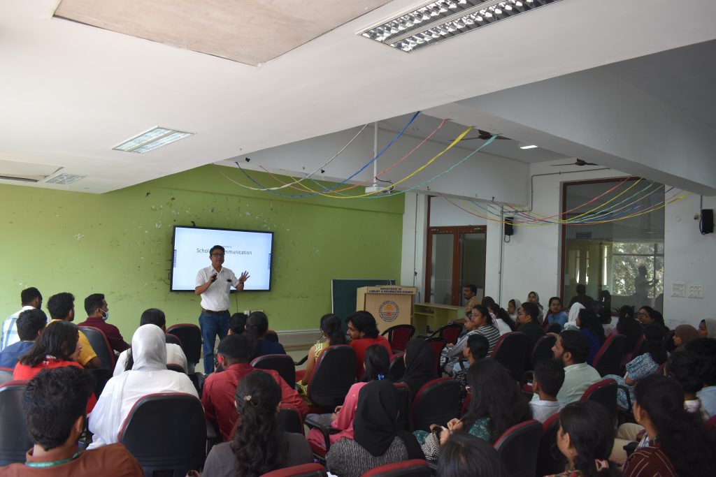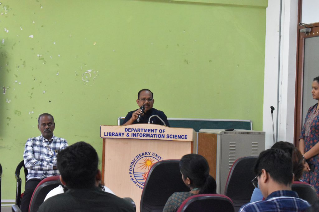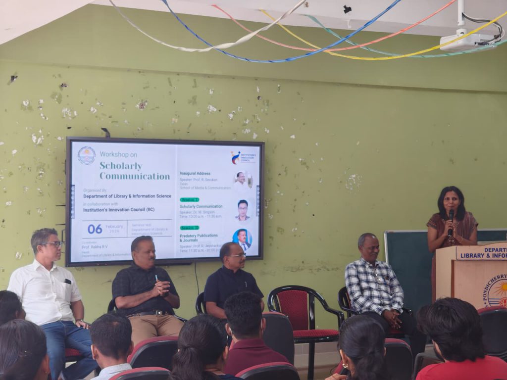 The Department of Library and Information Science, in collaboration with Pondicherry University’s Institution’s Innovation Council, organized a half-day workshop on “Scholarly Communication” on February 6, 2026, attracting 82 enthusiastic participants. The event was inaugurated by Prof. R. Sevukan, Dean of the School of Media and Communication, who emphasized academic publishing and research dissemination and coordinated by Prof. Rekha R. V., Head of the Department. Dr. M. Singson led the first session on effective scholarly communication, journal selection criteria, communication modes and responsible AI use in research, while Prof. Jeyshankar’s second session addressed predatory publications, unethical practices and identifying credible journals. The highly interactive workshop provided valuable insights into scholarly publishing, concluding successfully with positive participant feedback.
