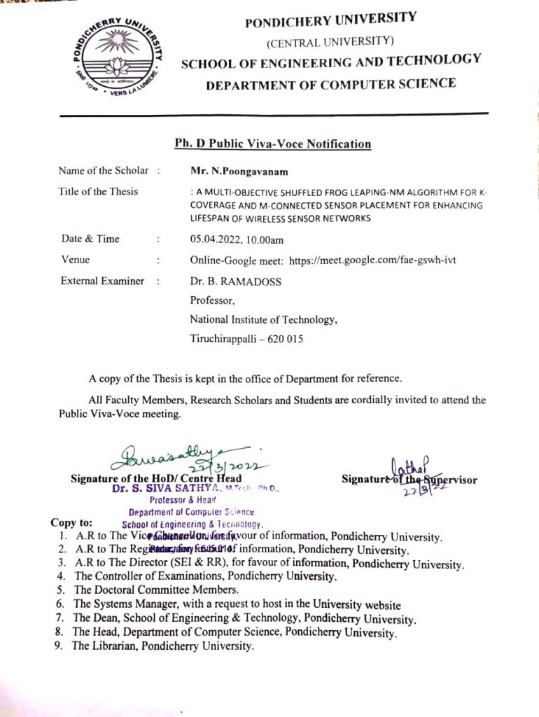 Ph.D. Public Viva-Voce notification of Mr. N. Poongavanam on 05.04.2022