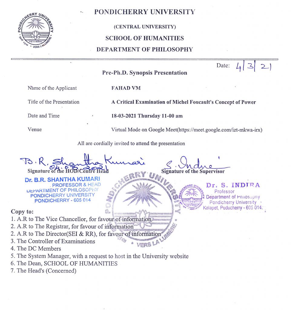 Pre-Ph.D. Synopsis Presentation of Fahad VM on 18.03.2021