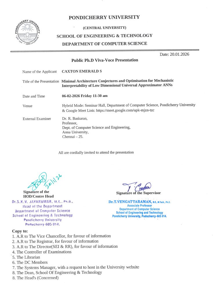 Public Ph.D. Viva-Voce Presentation notification of Mr. Caxton Emerald S on 06.02.2026