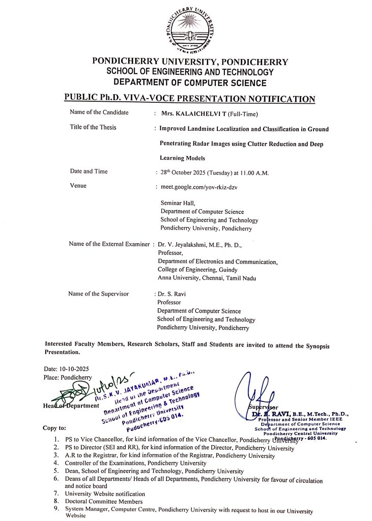 Public Ph.D. Viva-Voce Presentation notification of Mrs. Kalaichelvi T on 28.10.2025