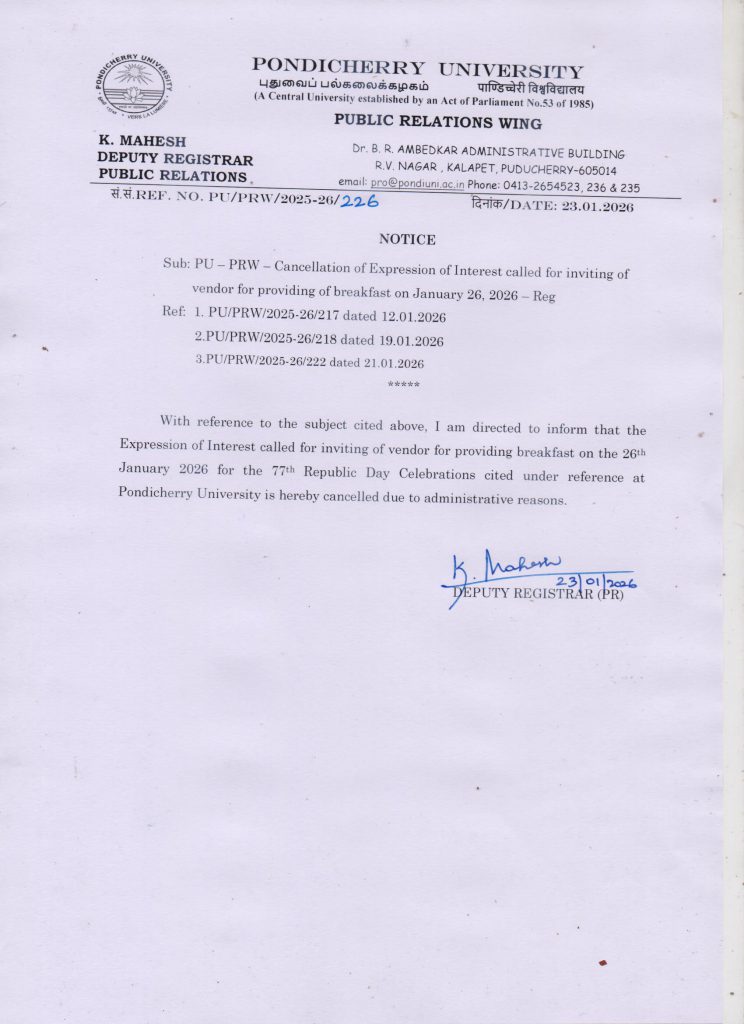 Cancellation of Expression of Interest called for inviting of vendor for providing breakfast