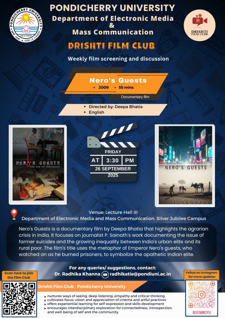 Drishti Film Club, Department of Electronic Media and Mass Communication, organises a documentary film screening, “Nero’s Guest” by Deepa Bhatia