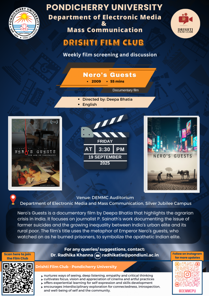 This is to inform you that the screening of the film “Nero’s Guest,” organised by the Drishti Film Club, Department of Electronic Media and Mass Communication, on 19.09.2025, has been postponed due to unavoidable reasons