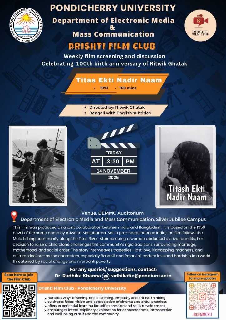 Drishti Film Club, Department of Electronic Media and Mass Communication, organises a Ritwik Ghatak film screening, “Titas Ekti Nadir Naam”.
