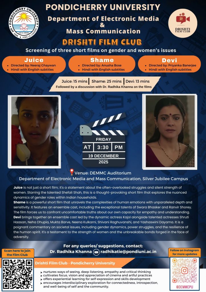 Drishti Film Club, Department of Electronic Media and Mass Communication, organises a series of three short films on gender and women’s issues: Juice, Shame and Devi