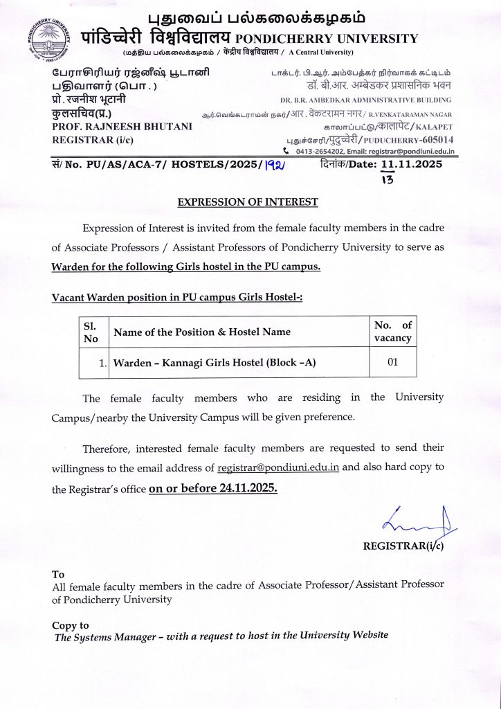 Expression of Interest is invited to serve as Warden – Kannagi Girls Hostel (Block-A) in the Pondicherry University Campus