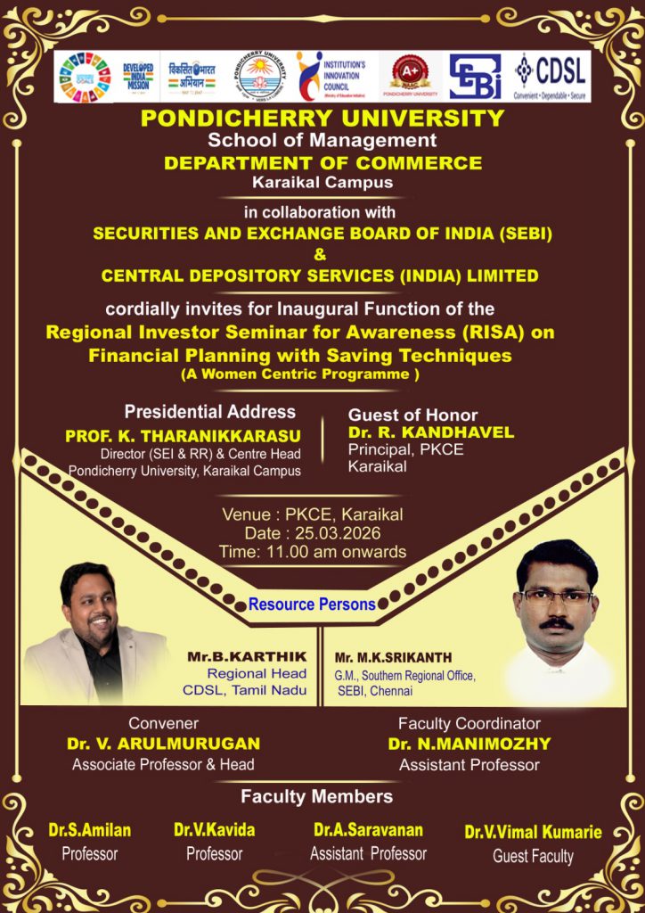 Inaugural Function of the Regional Investor Seminar for Awareness (RISA) on Financial Planning with Saving Techniques – Department of Commerce, Karaikal Campus