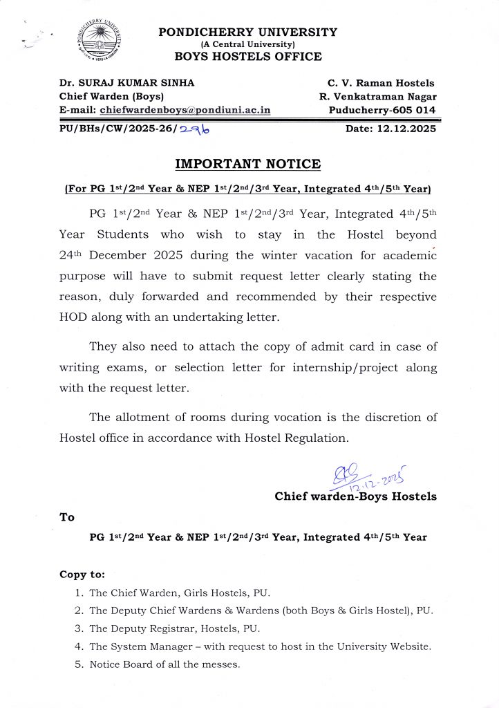 Notice-Hostel Residents (Boys & Girls)- Stay in Winter Vacation (PG 1st / 2nd Year & NEP 1st /2nd /3rd Year, Integrated 4th /5th Year)