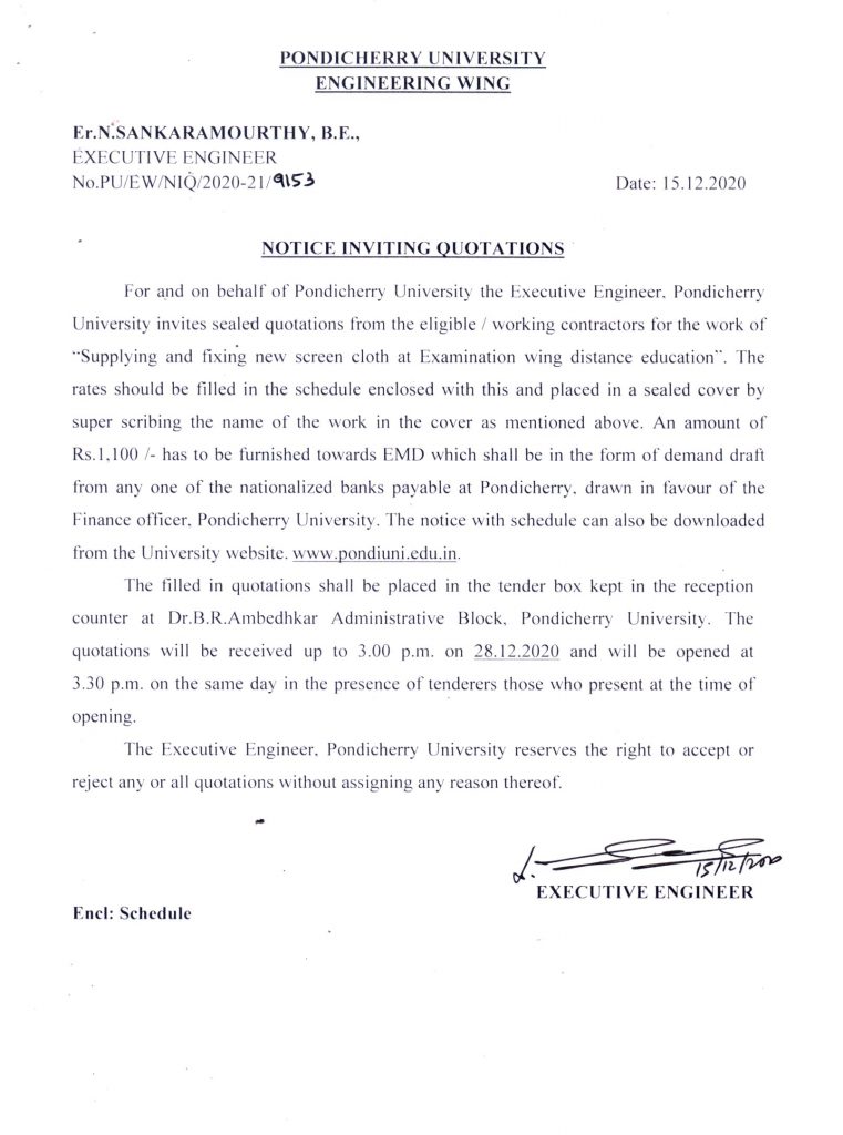 Notice Inviting Quotations – Supplying and Fixing New Screen Cloth at Examination Wing Distance Education