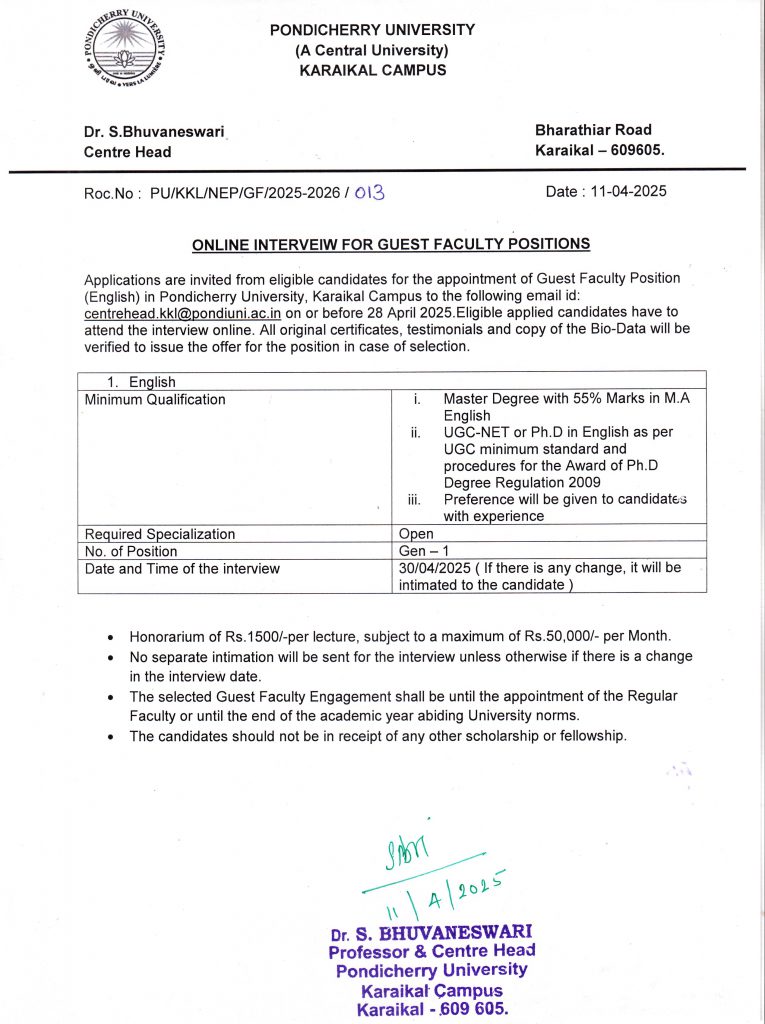 Online Interview for Guest Faculty Positions – Pondicherry University, Karaikal Campus