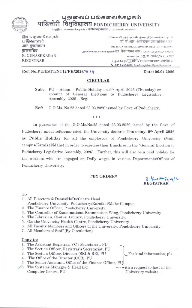 Public Holiday on 9th April 2026 (Thursday) on account of General Elections to Puducherry Legislative Assembly, 2026