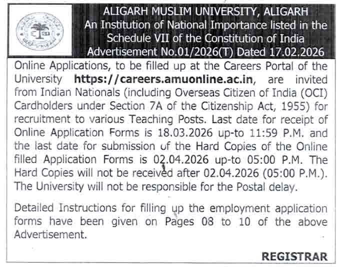 Recruitment to various Teaching positions, Aligarh Muslim University