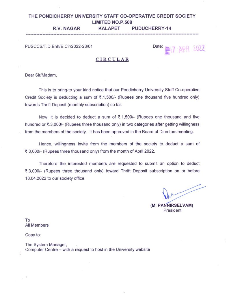 Thrift Deposit Monthly Subscription – Pondicherry University Staff Co-Operative credit Society Members